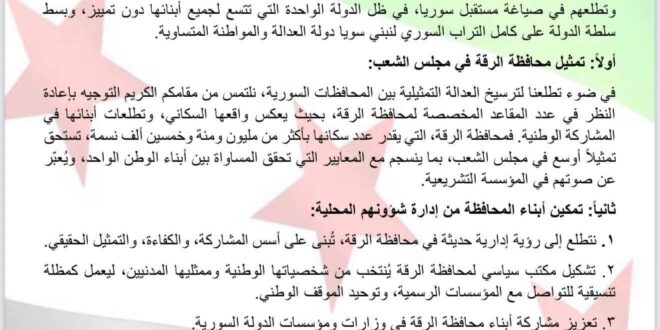 وجّهت قوى وشخصيات سياسية ومدنية من محافظة الرقة، بيانًا إلى الرئيس السوري “أحمد الشرع”، طالبت فيه بزيادة عدد مقاعد ممثلي محافظة الرقة في مجلس الشعب بما يتناسب مع عددها السكاني، وضمان تمثيل عادل لأبنائها.